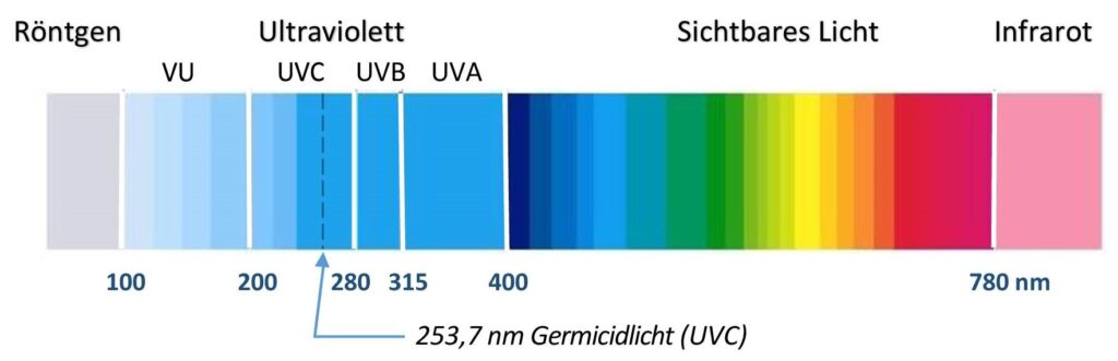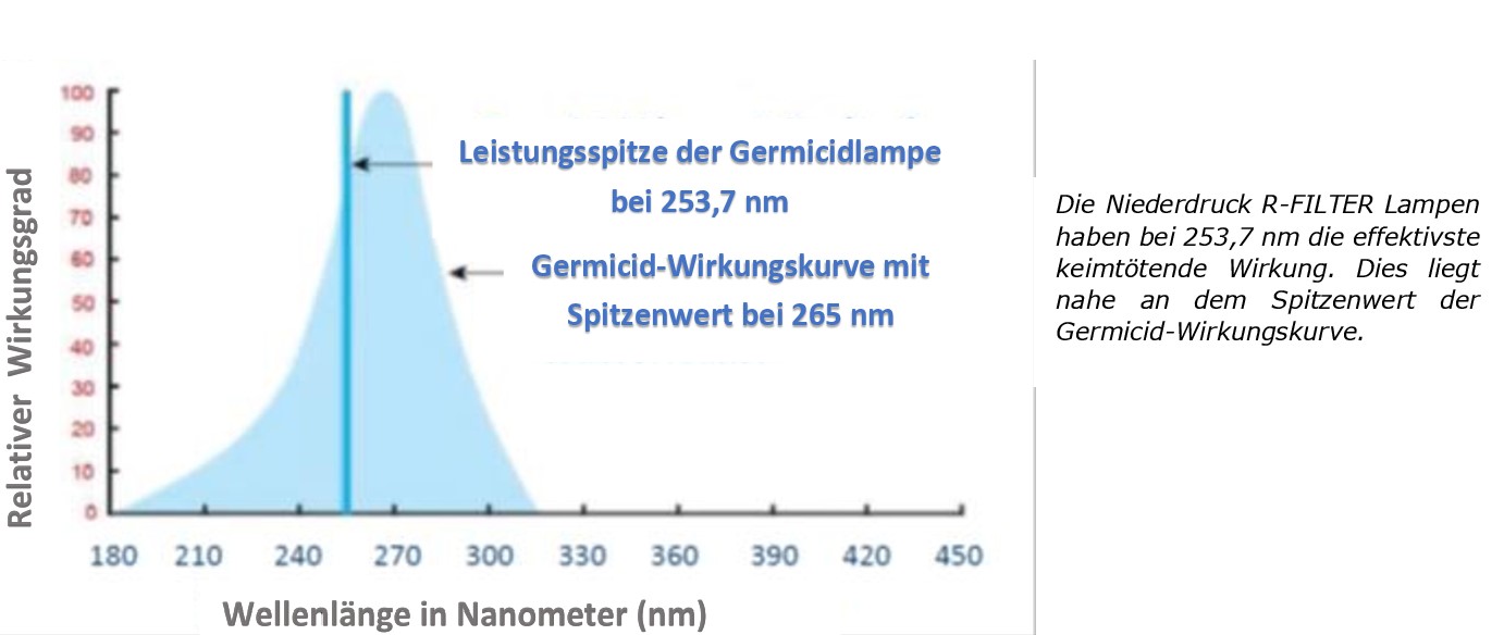 Die keimtötende bzw. bakterientötende Wirkung der UV-C-Strahlung erreicht bei 265 nm ihren Höhepunkt.
