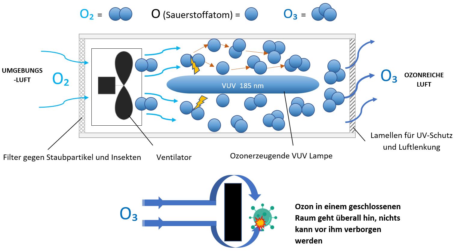 Sauerstoff (O)-Atome werden bei der Photolyse gebildet, wenn UV-Strahlung im Vakuum bei 185 nm Sauerstoffmoleküle (O₂) in zwei Sauerstoffatome zerlegt. Diese verbinden sich dann leicht mit einem Sauerstoffmolekül (O₂) zu einem triatomischen Sauerstoffmolekül (O₃), dem Ozon. Ozon ist aufgrund der schwachen Bindung, die das dritte Sauerstoffatom hält, ein instabiles Molekül. Diese Instabilität macht Ozon zu einem starken Oxidations-, Desinfektions- und Desodorierungsmittel. Die Wirkung tritt ein, wenn Ozonmoleküle mit oxidierbaren Substanzen wie Mikroorganismen, Viren, Bakterien, Schimmelsporen sowie organischen und anorganischen Verbindungen in Kontakt kommen. Einige Beispiele für die desodorierende Wirkung von Ozon:
