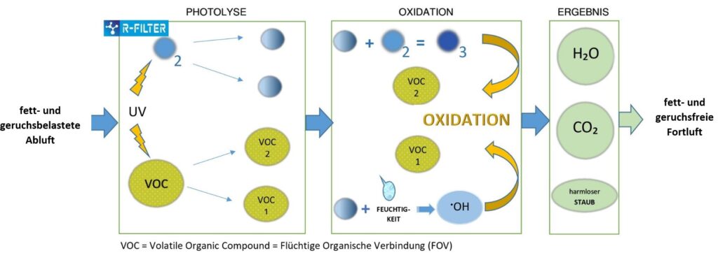 Selbst die wirksamsten Aerosolabscheider, die in Abzugshauben über Koch- oder Bratflächen eingesetzt werden, sind nicht in der Lage, Fettmoleküle abzuscheiden, die kleiner als 5 Mikrometer sind; sie wandern weiter und verunreinigen die Elemente des Lüftungssystems. Um dies zu verhindern, empfehlen wir R-FILTER-Geräte: R-FILTER-Breitband-UV-Lampen, die für den Fettabbau optimiert sind, strahlen im kurzwelligen Bereich und erzielen die gewünschte Wirkung in zwei Phasen. Unter dem Einfluss der ersten Phase (Photolyse) werden langkettige Fette in der Luft aufgespalten und aus den biatomaren Sauerstoffmolekülen (O2) werden in der Luft hochreaktive Sauerstoffatome (O) gebildet. In der zweiten Phase (Oxidation) wird Ozon (O3), das aus der Verbindung von einatomigem Sauerstoff (O) mit Luftsauerstoff (O2) oxidiert flüchtige organische Verbindungen (VOCs) stark, neutralisiert unangenehme Gerüche und desinfiziert die Luft. Darüber hinaus bilden Sauerstoffatome (O), die mit der Feuchtigkeit in der Luft reagieren, hochreaktive Hydroxylradikale (-OH), die mit kurzer Reaktionszeit und hoher Effizienz am Oxidationsprozess beteiligt sind. Das Endergebnis ist die Erzeugung von Wasserdampf, Kohlendioxid und einer geringen Menge an harmlosem Staub, der zusammen mit der Abluft abgeleitet wird und keine Ablagerungen hinterlässt. Der Luftkanal bleibt praktisch sauber und fettfrei. Vom Typ her gehört das Gerät in die Kategorie der UV-Geräte für die Aerosolbehandlung in Großküchen, gemäß der europäischen Norm EN 16282-8:2017.