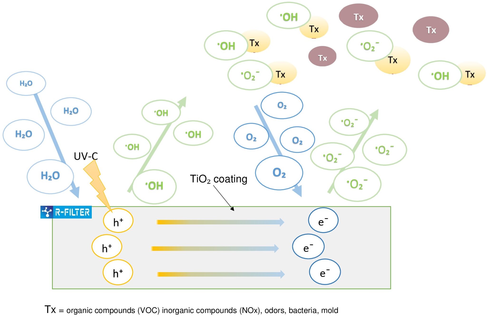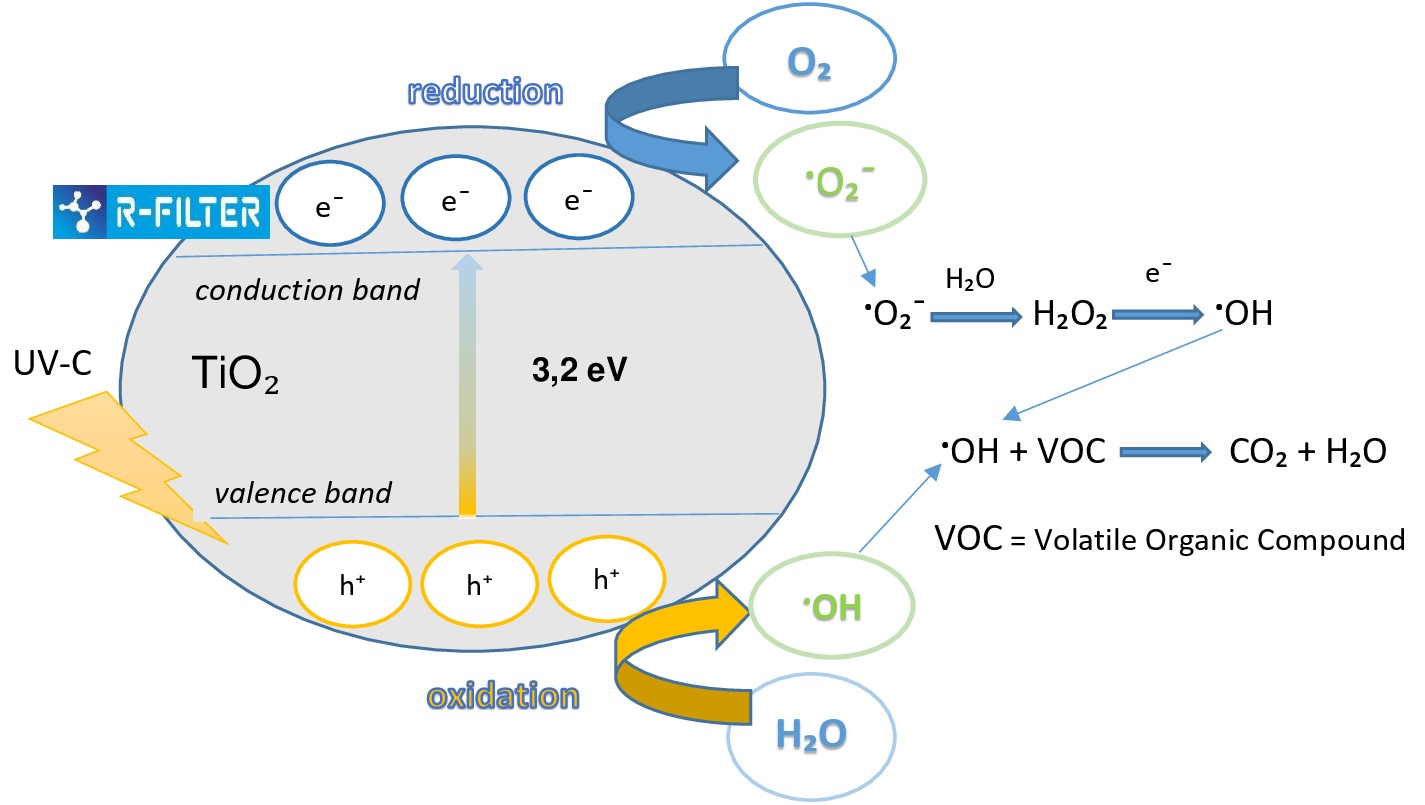 The following air purification process takes place on the TiO-coated surface2: