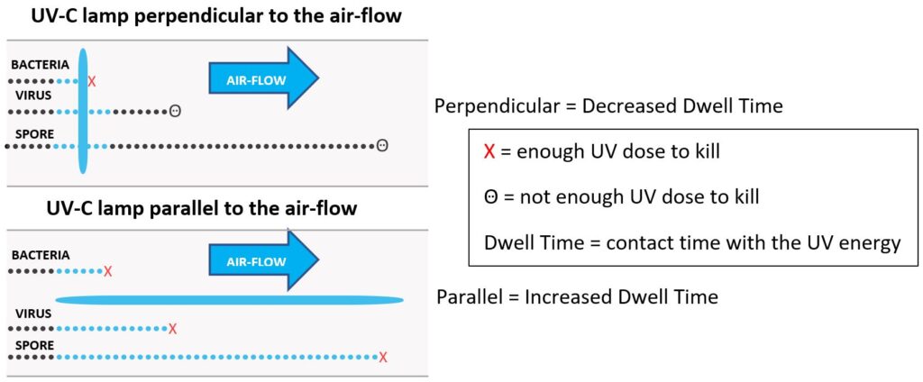 By installing the lamps parallel to the airflow, we can ensure a longer contact time (residence time) between microorganisms and the UV-C light: