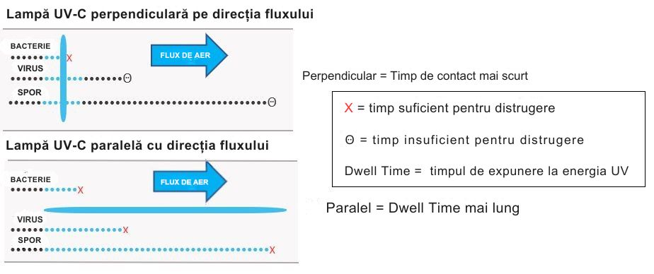 Prin instalarea lămpilor paralel cu fluxul de aer, putem asigura un timp de contact mai lung (timp de staționare) între microorganisme și lumina UV-C: