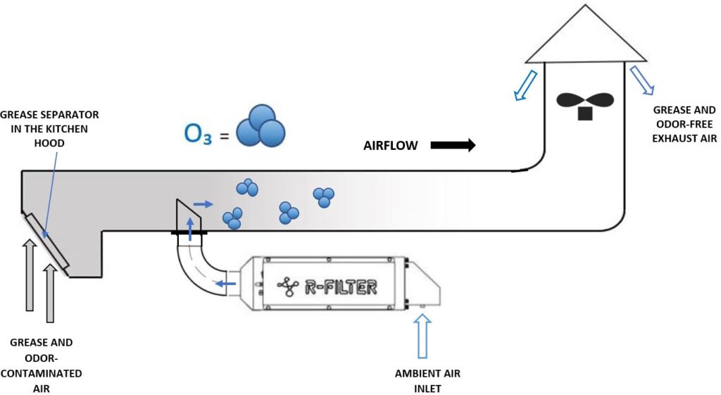 Our equipment is designed to be installed outside the exhaust duct, so that the UV lamps do not come into direct contact with grease-contaminated air. The kitchen exhaust fan draws air from the area surrounding the equipment and channels it through the unit into the air duct. The broad-spectrum UV lamps, located in the reaction chamber, generate a large amount of ozone from the oxygen in the air at a wavelength of 185 nm. The ozone molecules exiting the R-FILTER equipment and entering the air duct oxidize the grease and odorous substances, breaking them down and simultaneously generating harmless substances. The kitchen exhaust duct remains clean, free of grease, and free of unpleasant odors.