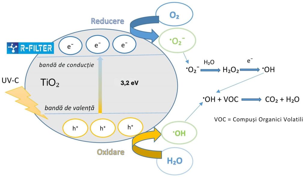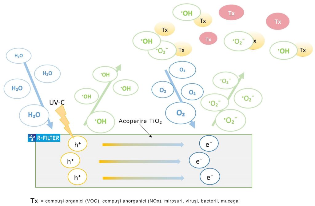 Acoperirea de mai sus este un semiconductor în care electronii (e-) sunt excitați în banda de conducție atunci când sunt iluminați cu lumină de o anumită lungime de undă, lăsând în locul lor goluri (h+). Golurile au un puternic efect oxidant, în timp ce electronii au un puternic efect reducător. Radicalii hidroxil (·OH) foarte reactivi se formează din apa care intră în contact cu suprafața, în timp ce radicalii superoxid (·O2-) reactivi se formează din oxigenul din aer. Ca rezultat, poluanții sunt descompuși, iar microorganismele sunt distruse prin deteriorarea structurii ADN-ului lor. Microbii și materia organică sunt mineralizați, producând dioxid de carbon și apă. O imagine transversală care arată procesul de descompunere a compușilor organici volatili (COV):