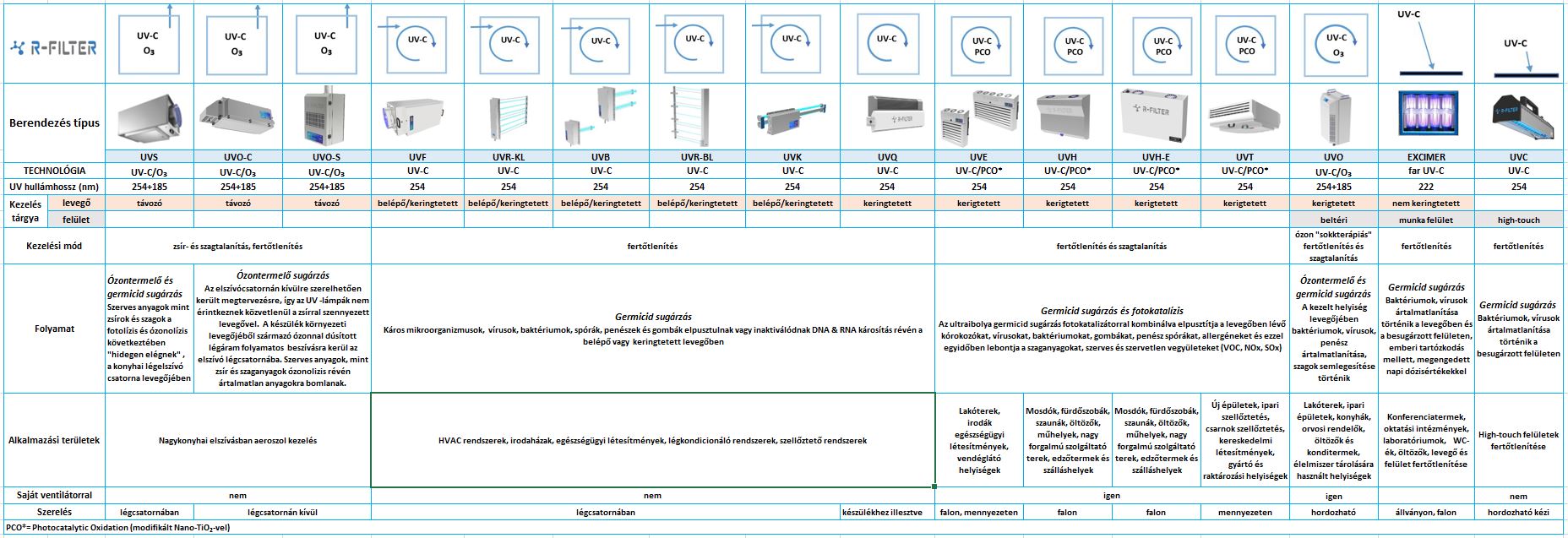 Az elsődleges célunk az volt, hogy olyan felhasználóbarát, költséghatékony technológiákat alkalmazva tervezzünk, amelyek a környezetre ártalmatlanok, vegyszerek, hagyományos szűrők és költséges élőmunka ráfordítás nélkül hatékonyan üzemelnek. Berendezéseinkben az UVC ill. VUV nagy energiájú fényt TiO2 nanofotokatalizátorral kombinálva alkalmazzuk.