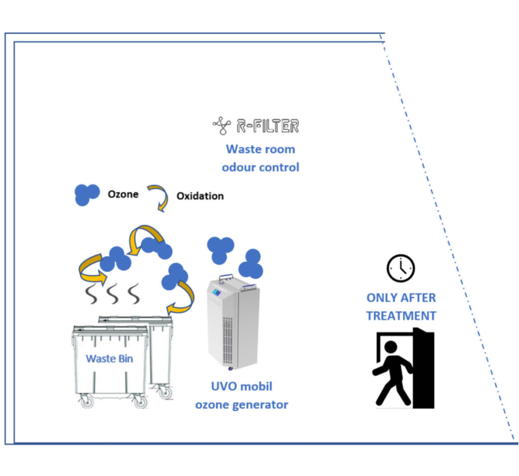 A szeméttároló helyiségek, a hulladékszétválasztó helyiségek, az újrahasznosító helyiségek és a helyi hulladékgyűjtő helyiségek a keletkező szagok miatt gyakran igen zavaró hatást fejtenek ki a környezetükre. R-FILTER UV-ózongenerátoraink hatékonyan csökkentik a nem kívánt szagokat a sorolt helyiségekben. A szemétszagok, baktériumok és mikroorganizmusok lebomlanak és megszűnnek létezni a germicid hatású (254 nm) és az ózont termelő (185 nm) UV fény hatására.