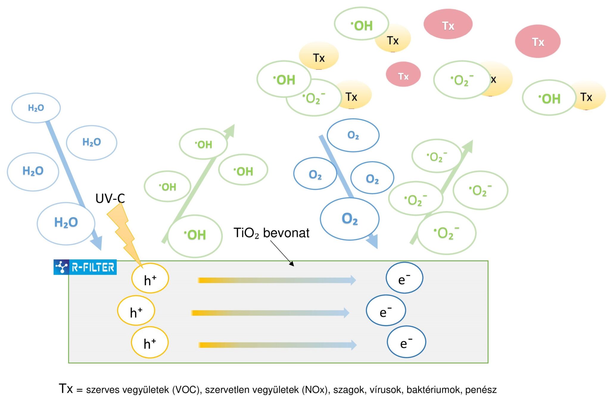 A fenti TiO₂ bevonat egy olyan félvezető, melyet bizonyos hullámhosszú fénnyel megvilágítva elektronokat (e-) léptetünk ki a vezetési sávba, lyukakat (h+) hagyva a helyükön. A lyukak erős oxidáló, az elektronok erős redukáló hatást fejtenek ki. A levegő páratartalmából eredő vízből igen reaktív hidroxilgyökök (·OH) jönnek létre, míg a levegő oxigénjéből reaktív szuperoxid gyökök (·O2-) keletkeznek. A levegőben lévő szaganyagok elbomlanak, a mikroorganizmusok a DNS szerkezetük roncsolódása révén pedig elpusztulnak és belőlük csupán széndioxid és víz marad vissza, mely a megtisztult levegővel távozik. A titándioxid bevonat nem használódik el, tartósan működőképes marad.