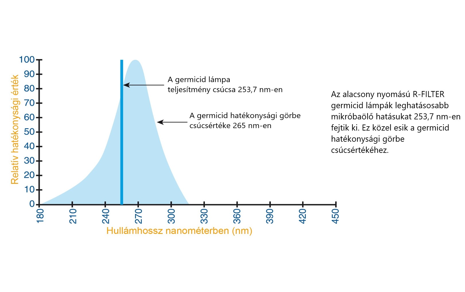 Az UV-C sugárzás germicid, azaz baktériumölő hatékonysága 265 nm-en éri el a maximumát.