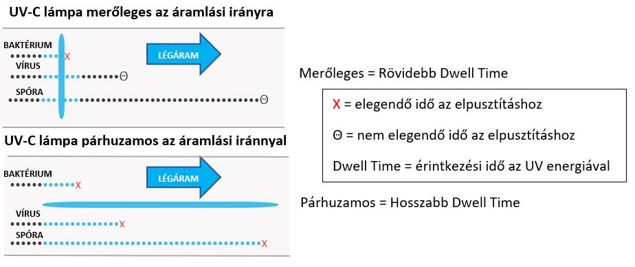 A lámpákat a légárammal párhuzamosan szerelve, hosszabb érintkezési időt (tartózkodási időt) tudunk biztosítani a mikroorganizmusok és az UV-C fény között: