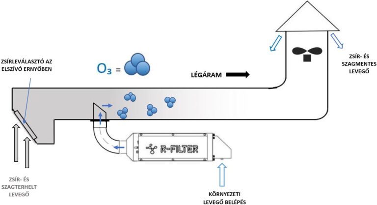 Készülékünk az elszívócsatornán kívülre került megtervezésre, így az UV-lámpák nem érintkeznek közvetlenül a zsírral szennyezett levegővel. A konyhai elszívó ventilátor a készülék környezetéből a készüléken keresztül levegőt szív be a légcsatornába. A reaktorkamrában elhelyezett széles spektrumú UV lámpák a 185 nm-es tartományban a levegő oxigénjéből nagy mennyiségű ózont állítanak elő. Az R-FILTER berendezésből kiáramló ózonmolekulák a légcsatornába jutva oxidálják a zsír és szaganyagokat, ártalmatlan anyagok keletkezése mellett elbontják azokat. A konyhai elszívó légcsatorna tiszta és zsírmentes marad és kellemetlen szagoktól mentes.