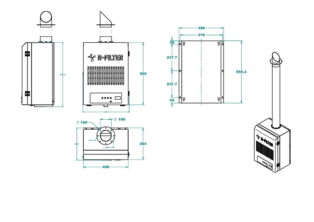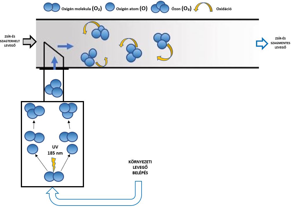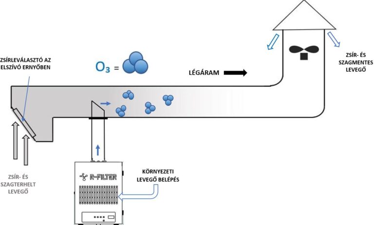 Készülékünk az elszívócsatornán kívülre került megtervezésre, így az UV-lámpák nem érintkeznek közvetlenül a zsírral szennyezett levegővel. A konyhai elszívó ventilátor a készülék környezetéből a készüléken keresztül levegőt szív be a légcsatornába.  A reaktorkamrában elhelyezett széles spektrumú UV lámpák a 185 nm-es tartományban a levegő oxigénjéből nagy mennyiségű ózont állítanak elő. Az R-FILTER berendezésből kiáramló ózonmolekulák a légcsatornába jutva oxidálják a zsír és szaganyagokat, ártalmatlan anyagok keletkezése mellett elbontják azokat. A konyhai elszívó légcsatorna tiszta és zsírmentes marad és kellemetlen szagoktól mentes.