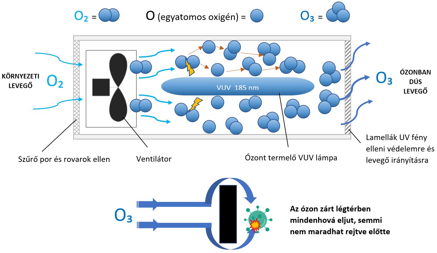 A reaktorkamrában a környezeti levegő oxigén tartalmából a 185 nm hullámhosszra hangolt VUV-lámpák nagy mennyiségű ózont állítanak elő: