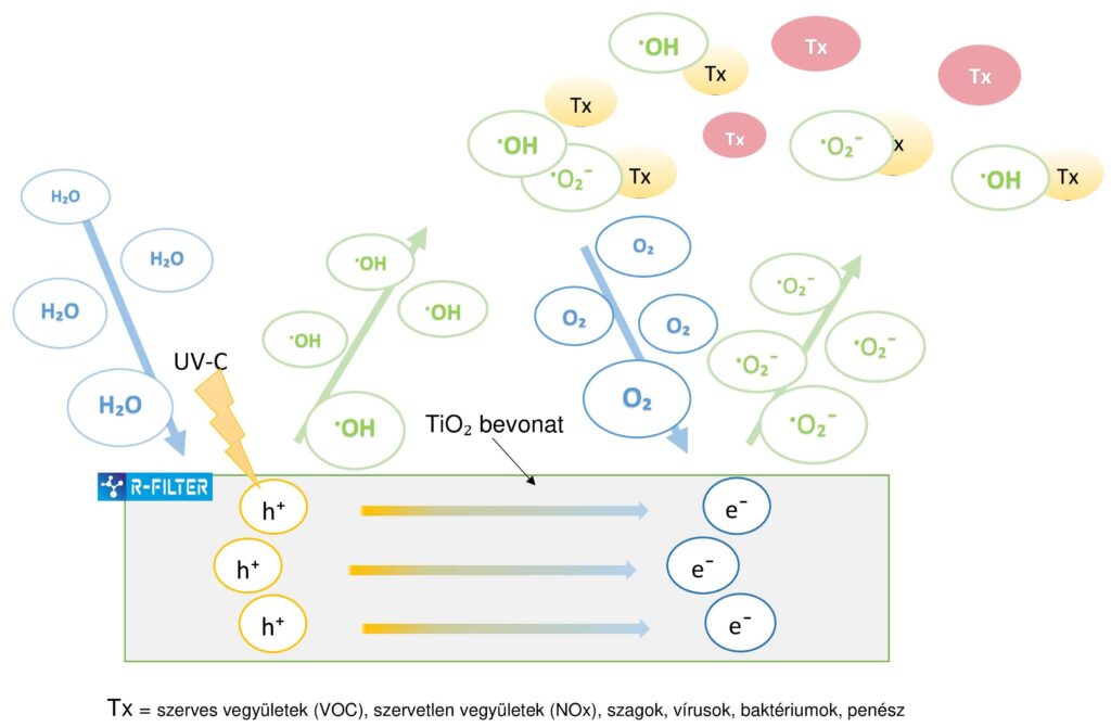 A TiO2 bevonatos felületen az alábbi légtisztítási folyamat zajlik: